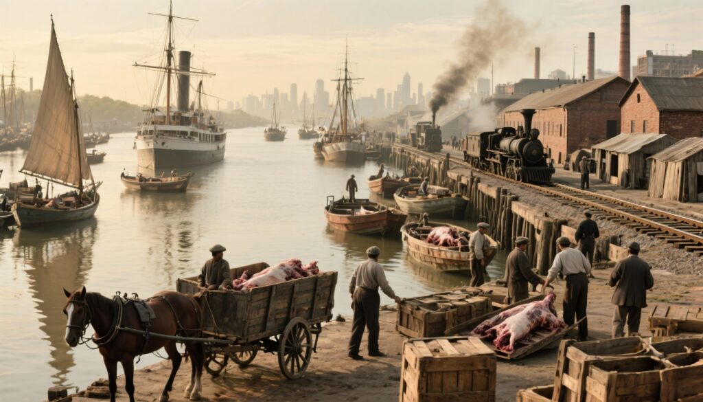 La libre competencia, que aún regía soberana en el transporte marítimo, hacía que, al amparo del enorme material a flote, muy superior a las necesidades del momento comercial del mundo, pudiera mantenerse este tipo de puerto que como el de Buenos Aires negaba toda posibilidad de acelerar las operaciones. Será pues preciso que la entrada de los ferrocarriles a la ciudad de Buenos Aires, el establecimiento de líneas navieras regulares y un conjunto de factores que analizaremos oportunamente impulse a la construcción del puerto que había de requerir el manejo de la carga cuyo volumen podría ya sospecharse. Hasta 1880 el gobierno de Buenos Aires que ejercía la soberanía sobre el puerto, solamente había intentado resolver este problema profundizando el Riachuelo, es decir ubicaba el puerto comercial en el lugar de emplazamiento de las barracas. Es probable que este trabajo de profundización del Riachuelo sea el que decidió la instalación de los establecimientos frigoríficos inaugurados pocos años después del 80; pero ella resolvía un aspecto puramente parcial del problema portuario, cuál era el de alojar al barco en un sitio abrigado mientras realizaba sus operaciones; desde luego que mediante la profundización, no sólo de su cauce sino también de su desembocadura, facilitaba el acceso del mencionado fondeadero.