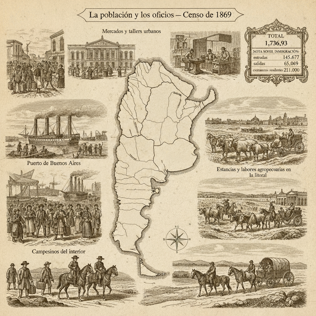 En el medio geográfico económico formado por las provincias, es decir con exclusión de la totalidad de los territorios nacionales denominados entonces Chaco, Misiones y Patagonia, habitaba en 1853 según cálculo de Diego de la Fuente, director del Censo de 1869, un millón de habitantes; no obstante que el propio de la Fuente incluye en un estudio preliminar a esa publicación el volumen de la población argentina de 10 en 10 años a partir de 1809, ninguna información precisa permite abrir juicio sobre la exactitud de la curva construida con esos elementos. La primera información objetiva es el censo de aquel año que atribuye a la zona mencionada 1.736.923 y 1.877.490 si se agrega a aquélla la de los territorios enumerados antes y la de los argentinos que vivían ese año en el extranjero. El detalle de esa población según las zonas en que la divide de la Fuente es la siguiente: